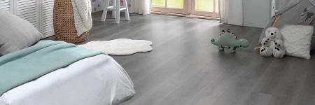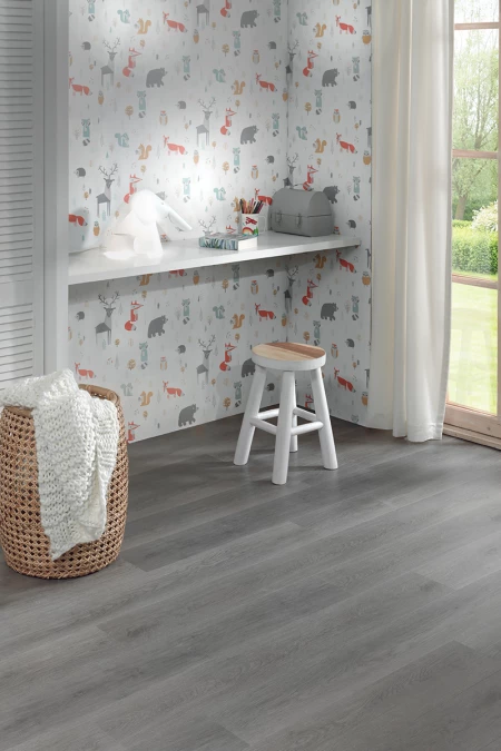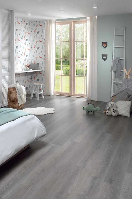 Un sol gris dans une chambre d’enfant ? Combinaison parfaite ! Vous pouvez alors ajouter des touches amusantes comme dans ce projet. Ici, il a été combiné avec du vert. Cette chambre d’enfant doit devenir une chambre solide pour un(e) ado ? Cool ! Avec ce sol en vinyle, tout est possible ! Le gris intemporel et les lames sobres proposent un look qui vous accompagnera des années !