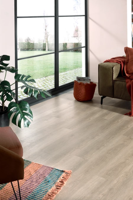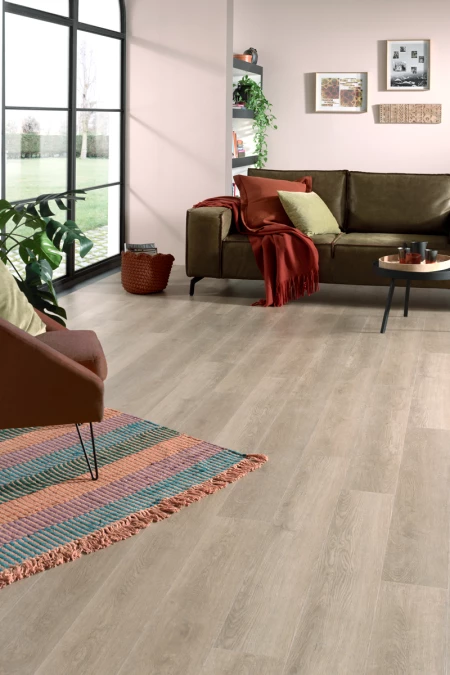 Les habitants de cette maison sont fans du style bohème chic et ont choisi des tons chauds et terreux comme le terracotta et le vert jungle. Le Parquetvinyl à structure bois dans une couleur neutre garantit une harmonie parfaite.