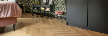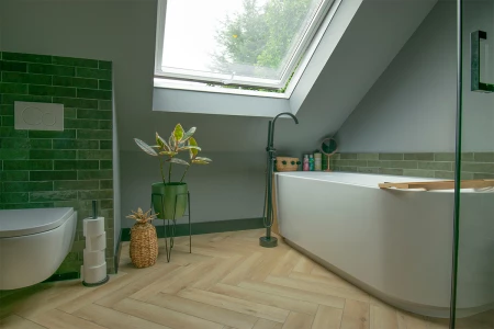 Chambre à coucher et salle de bains au même étage ? Pas de problème, même avec des pieds mouillés, le vinyle Parquet continue de briller ! Ce Yukon Mistral à chevrons s'intègre parfaitement à l'intérieur de la jungle urbaine. La résistance à l'eau du Parquetvinyl fait que ce sol peut être installé dans la salle de bains sans aucun problème.